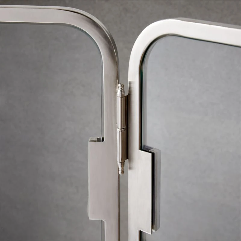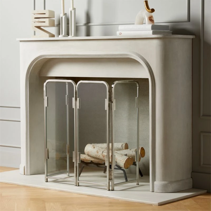 Vintage-inspired fireplace screen adds a timeless touch to your living space. Welded from stainless steel plated in polished nickel, with two configurations that cater to style preference: zig zagged or with outer corners angled. Heat-resistant glass finishes things off. CB2 exclusive.