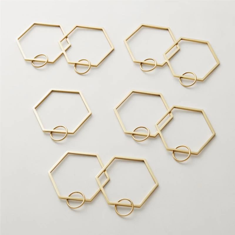Set of nine polished brass drapery rings hang curtains in geometric form. An edgy complement to the Bolt curtain collection designed by Sasha Adler.