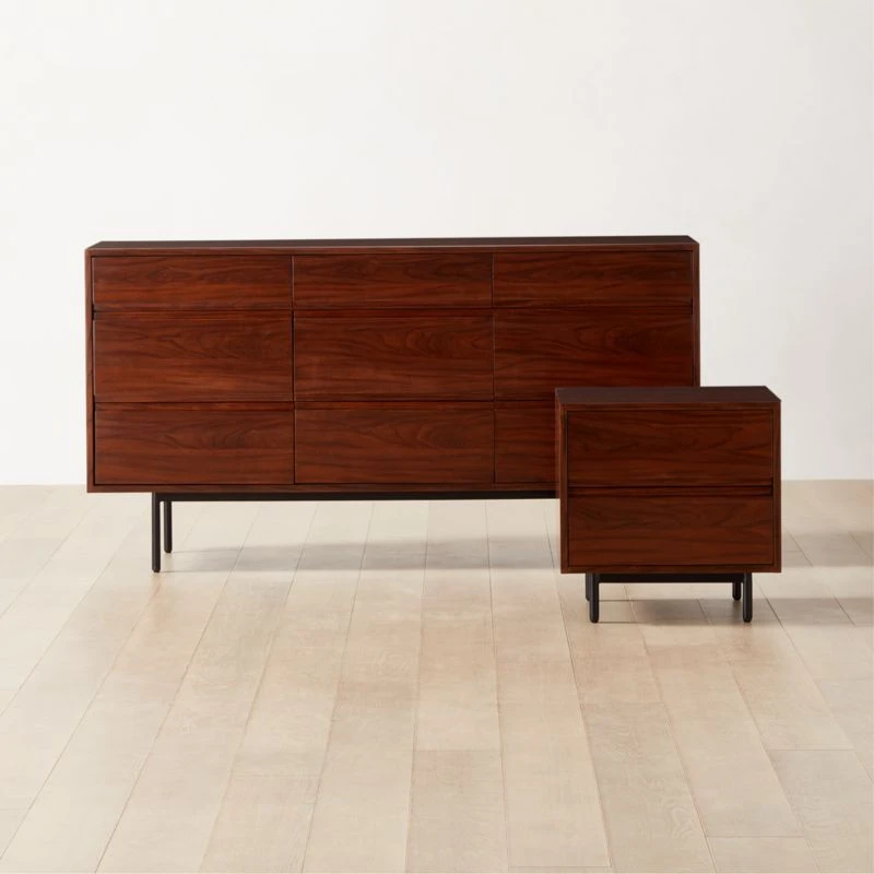 Sleek nightstand by VUUE wears its Brazilian modernist influences well. Clean-lined frame of solid mindi wood is graced with a faux rosewood veneer whose rich grain contrasts with cylindrical metal legs. Two soft-close, undermounted drawers glide smoothly to reveal ample room for bedtime essentials. CB2 exclusive.