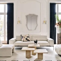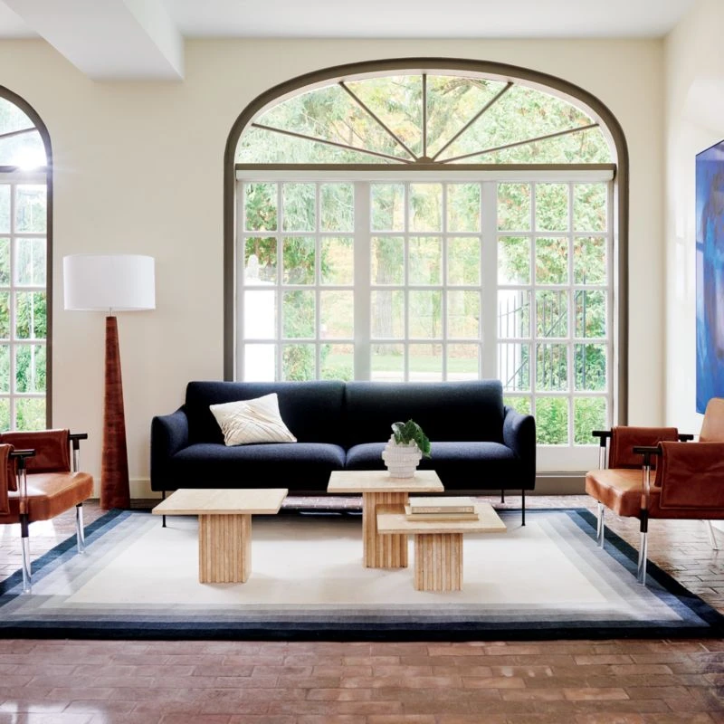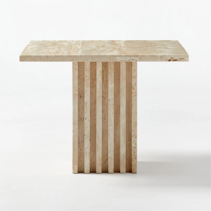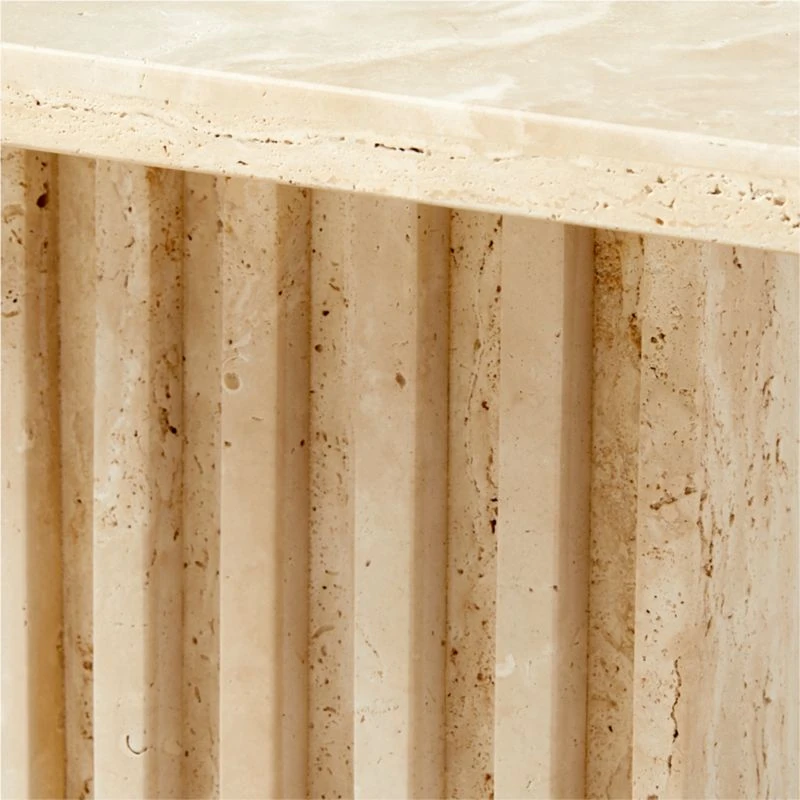 Cocktail table is made of pure, unpolished travertine and inspired by 1970s Italian modern designs, featuring an architectural silhouette, layered ivory tones and a style we’re calling “soft brutalism.” Fluted details on the base and variation in the natural travertine add to the coveted vintage feel. Learn about Studio Anansi on our blog. CB2 exclusive.