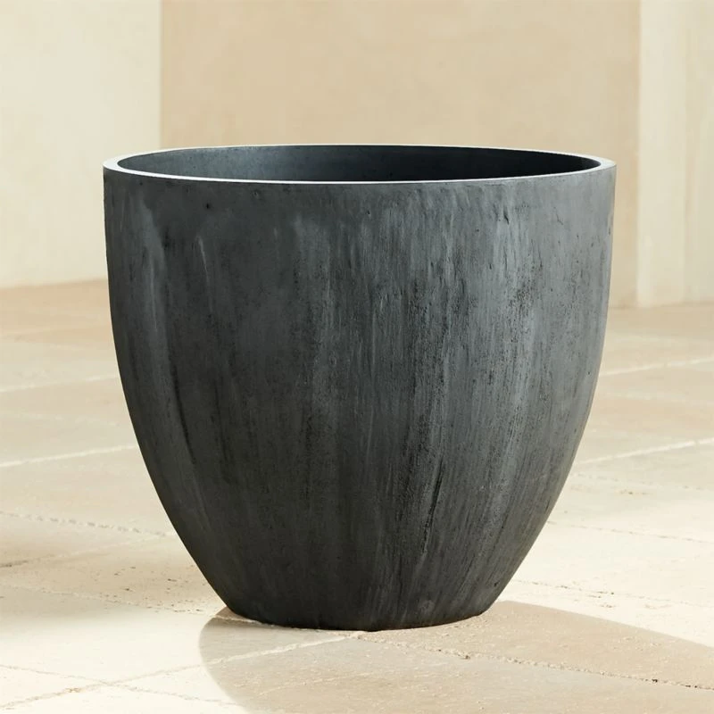 Planter sets a sleek spot for greenery to thrive. Made of a mix of resin and stone, then finished charcoal grey, planter sets modern roots in any outdoorscape. CB2 exclusive.