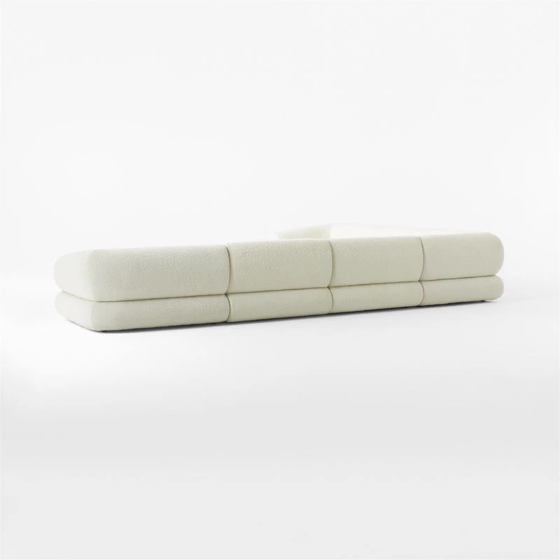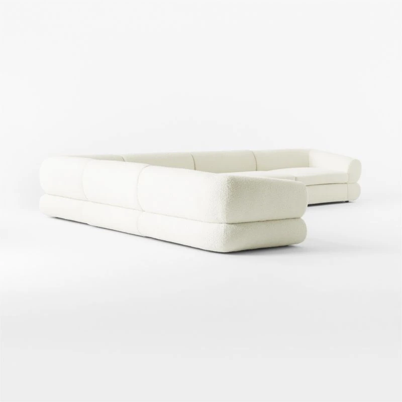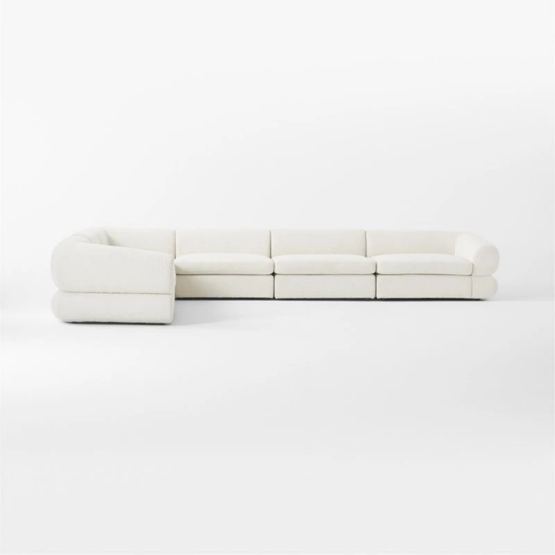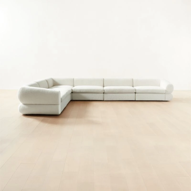 Designed in Barcelona by Mermelada Estudio and fully upholstered in ivory boucle, this sectional sofa is spacious, low and loungey. The soft, sloping arm and rounded silhouette borrow from ’70s Italian design, while deep-seated cushioning is the pinnacle of modern comfort and style. CB2 exclusive.