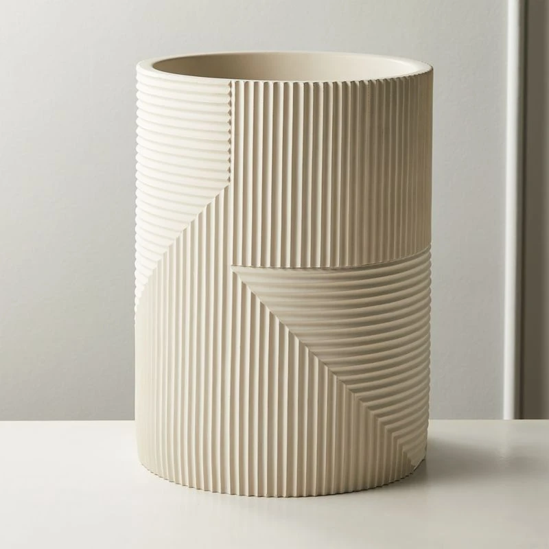 Vertical and horizontal lines cement a graphic design in this light grey decorative wastebasket. CB2 exclusive.