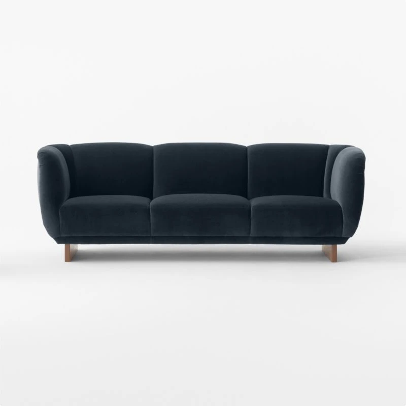 New York-based designer Nicholas Obeid’s three-seat sofa marries classic French style with 1940s glamour. Faceted corner detail on arms offers a traditional feel, while the simplicity of the plinth base makes it fresh and modern. birch and solid oak frame and leg. Semi-attached seat cushions create the look of a loose cushion while providing a firmer sit for entertaining or lounging. Looks rich, lustrous and inviting in chic slate velvet. CB2 exclusive.