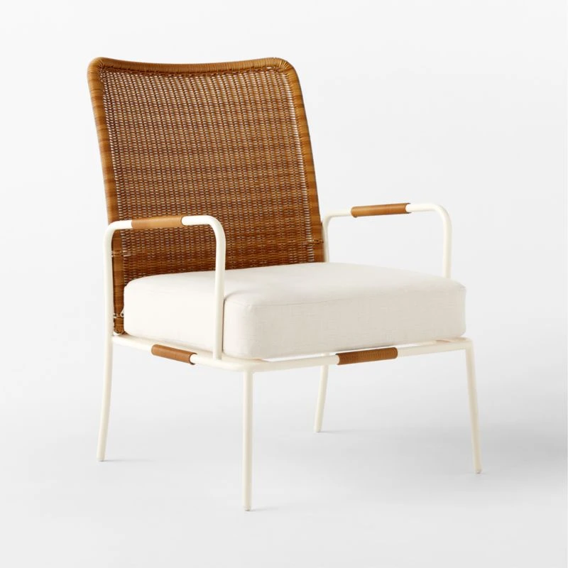 Paying homage to 1960s-style French villas, outdoor lounge chair by Ross Cassidy is understated in its luxury. Angular steel frame, powdercoated in an ivory hue, is accented by wrapped all-weather rattan to match the tall back. Plush, supportive cushion is covered in fade- and stain-resistant Sunbrella performance fabric to weather season after season of sunset cocktail hours. CB2 exclusive.