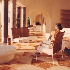 Colombe Ivory Metal And Rattan Outdoor Loveseat With Ivory Sunbrella® Cushions