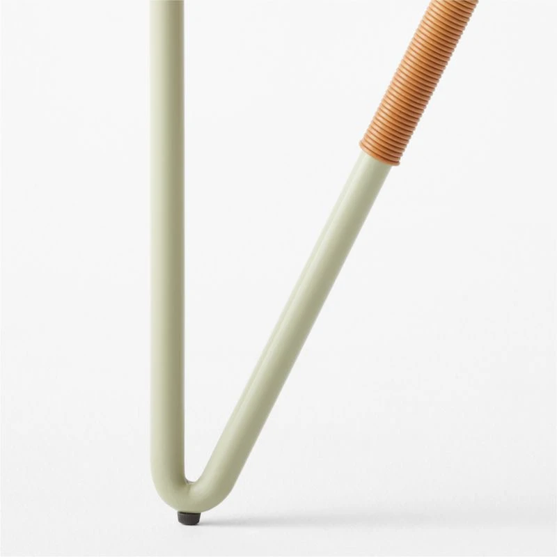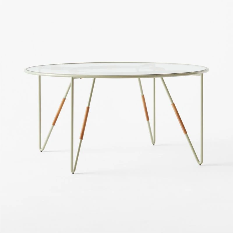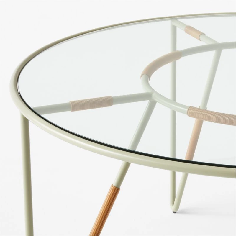 Paying homage to 1960s-style French villas, outdoor dining table by Ross Cassidy is understated in its luxury. Angular steel frame, powdercoated in a green tea hue, is accented by wrapped all-weather rattan. Tempered glass top allows clear views of this modern vintage design. Sized to fit on a terrace, this table is ideal when styled as part of a conversation set. CB2 exclusive.