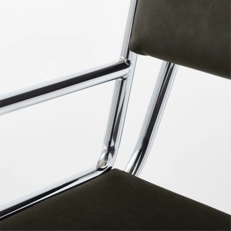 Designed by Barcelona-based Mermelada Estudio, this vintage-inspired office chair has a distinctly French industrial vibe. Polished nickel frame shows off soft black vegan leather. Adjustable height, swivel base, tilt-back and rolling casters round out the details. CB2 exclusive.