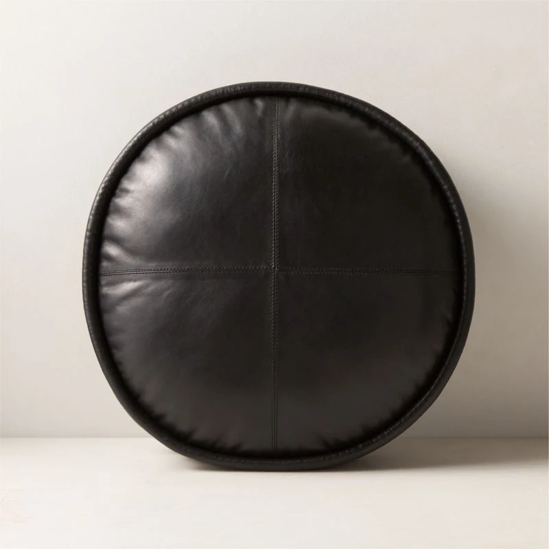 Round leather pillow has thick piping on its edges and stitched panels for a finely tailored look. Quadrants of smooth, buttery-soft leather will fade and develop a patina over time, much like a favorite moto jacket. CB2 exclusive.