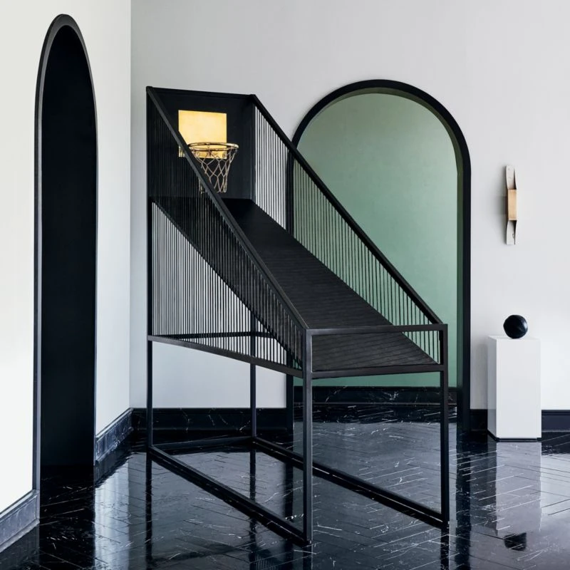 This is gametime with a velvet rope. Thanks to Barcelona-based design team Mermelada Estudio, the classic basketball arcade game just got a super-luxurious, high-fashion upgrade. Features black genuine leather and unlacquered brass backboard with cast brass hoop and chain; ramp and side rails are also clad in leather. Black nylon chording keeps the ball in play. All handsomely squared off with a matte black powdercoated steel frame. A truly covetable statement piece that redefines sport decor through the lens of luxury and where every shot is a bank shot. And don’t forget to fill up the rack with a few of our Leather Head Mini Black Leather Basketballs. CB2 exclusive.