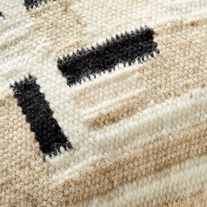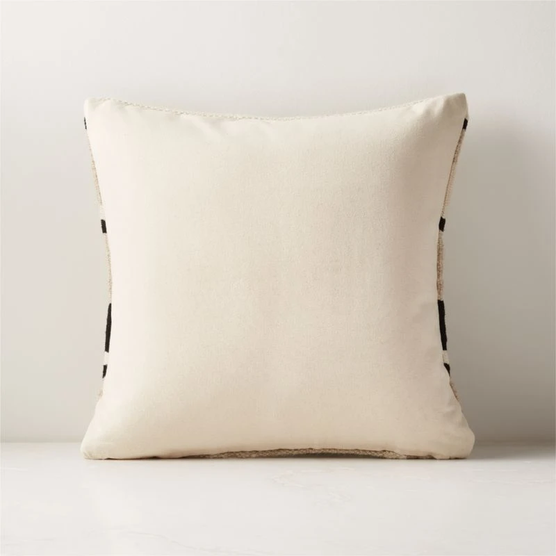 Natural and black geometric design is woven by hand on a traditional handloom to create this modern wool throw pillow. Woven pillow flips to a solid neutral cotton back. CB2 pillows include a pillow insert in your choice of feather down or down alternative. CB2 exclusive.