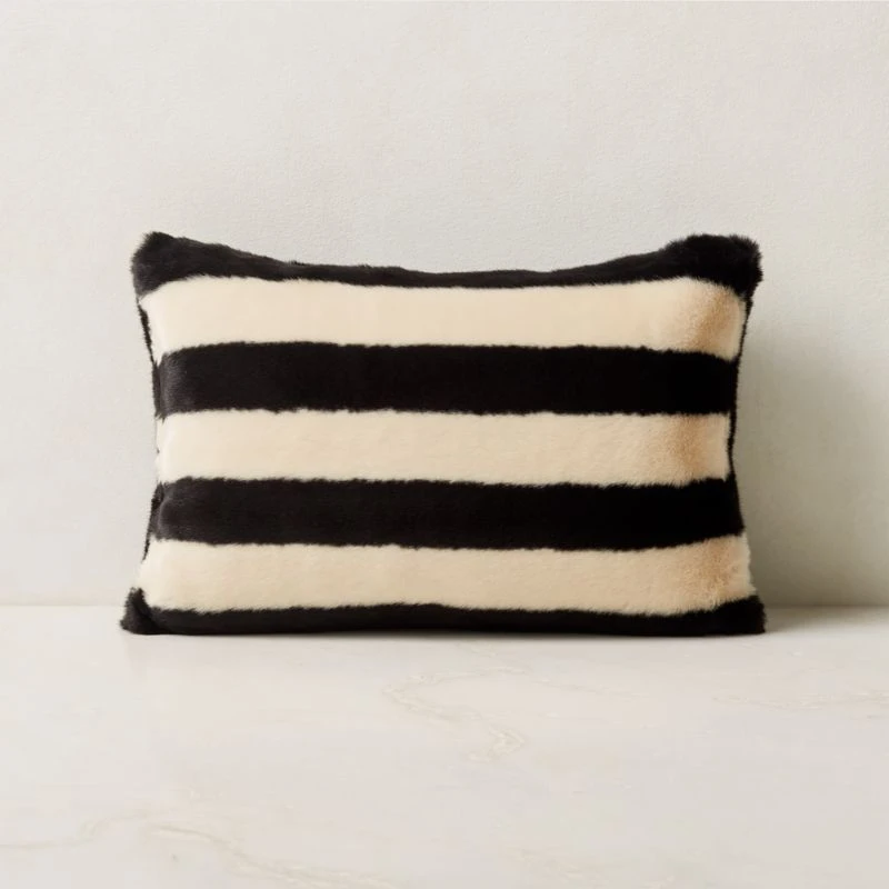 Elsie Black And White Striped Faux-Fur Throw Pillow With Down-Alternative Insert 18”x12”
