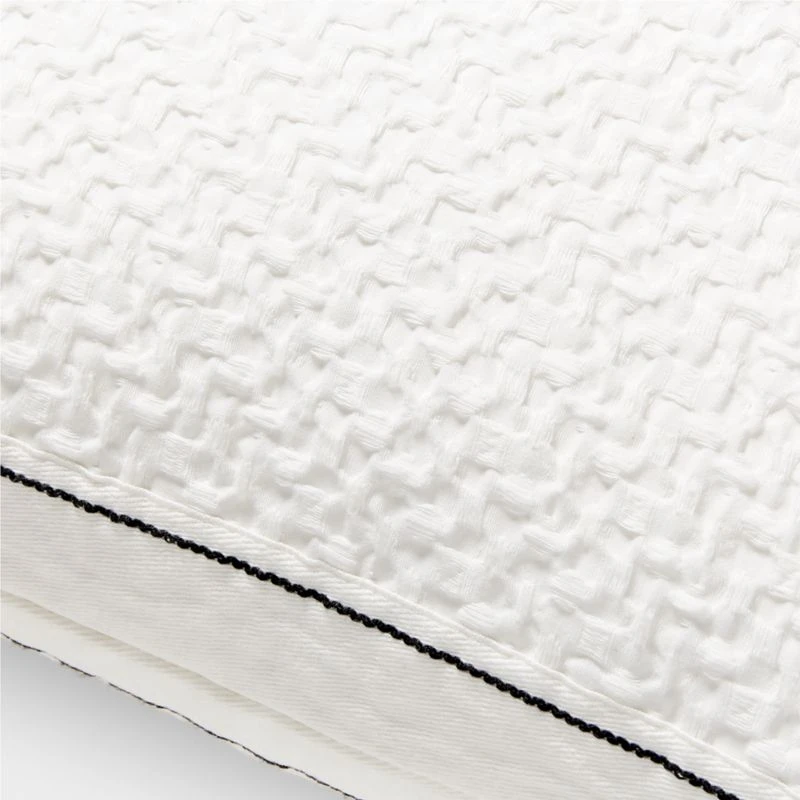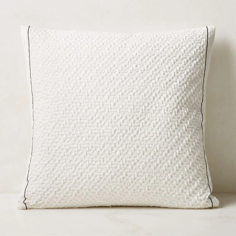 White throw pillow features an intricate weave with a splendid texture. Garment-dyed organic cotton pillow has black border stitching on both sides for just a hint of contrast. CB2 pillows include a pillow insert in your choice of feather down or down alternative. CB2 exclusive.