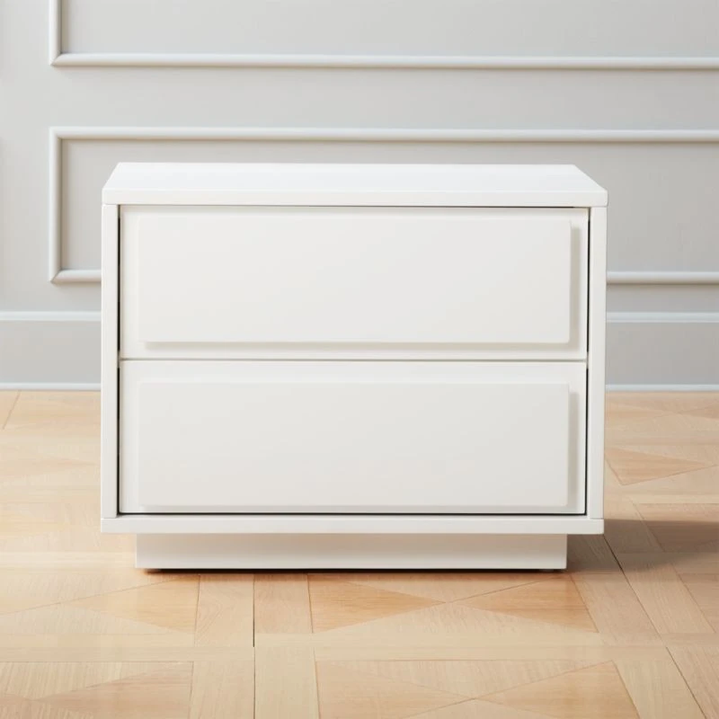 Minimal nightstand takes a modern turn in glossy white lacquer. Two roomy drawers cut a clean line with recessed drawer panels rather than traditional hardware. Slim plinth base keeps it sturdy and sleek. Learn about Mermelada Estudio on our blog. CB2 exclusive.