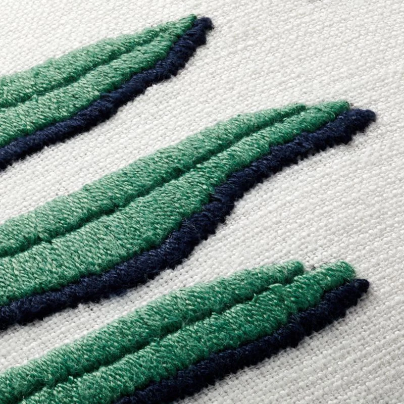 Outdoor pillow is embroidered with a lush blue and green design based on an original animal-inspired painting by Ross Cassidy. Made from recycled polyester, it’s an incredibly soft addition to the outdoor lounging space. CB2 exclusive.