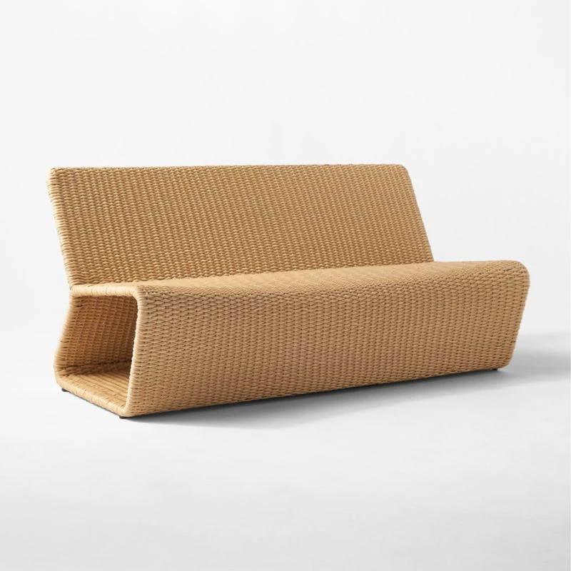 Showcasing a vintage silhouette and uninterrupted wicker detail, VUUE’s outdoor bench is made for lounging. Designed to mimic woven banana leaf, weather-resistant resin rattan is softer and more durable than its natural counterpart. With or without a cushion, the tighter weave provides comfort for two. CB2 exclusive.