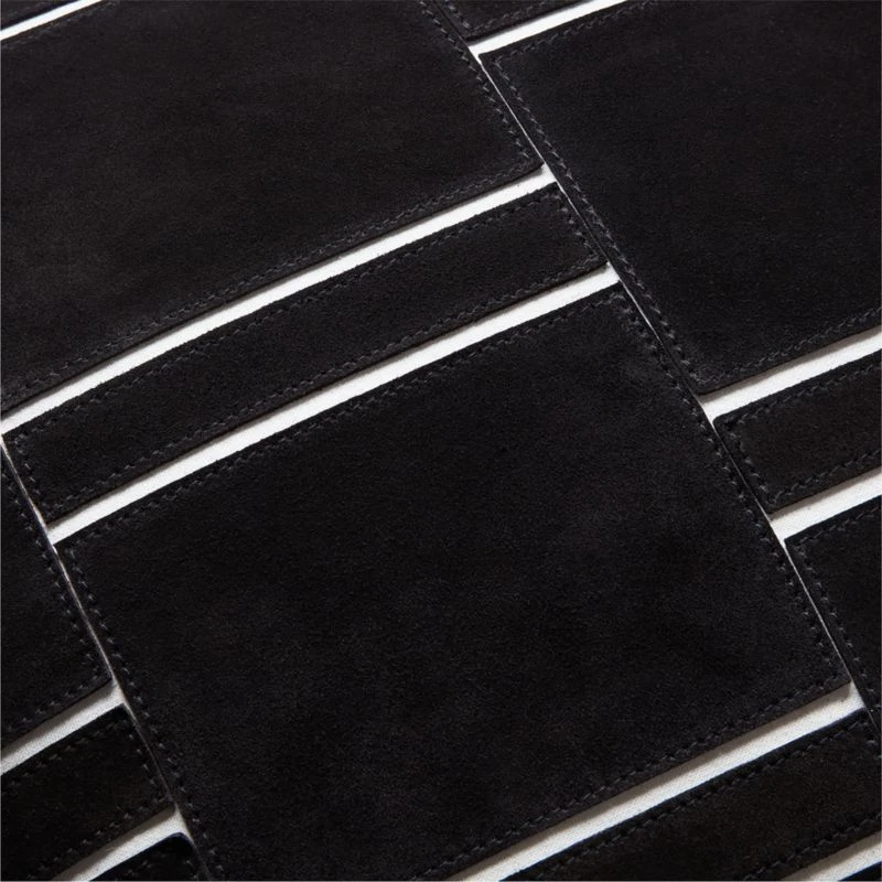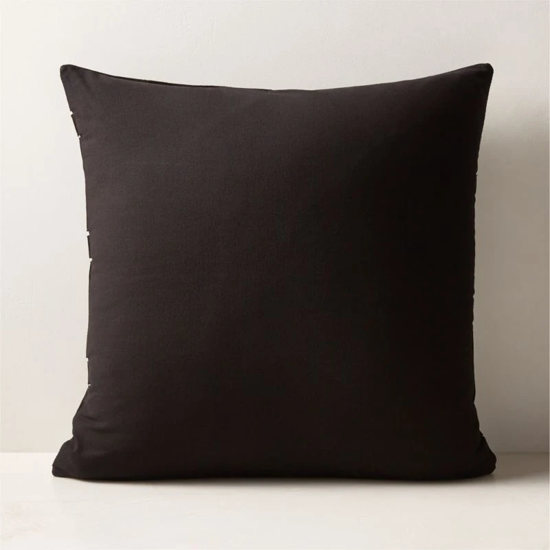 High-contrast suede throw pillow is a visual and tactile marvel for the sofa or bed. Panels of black suede are die-cut to reveal the white lining below, adding extra dimension and texture. A black solid cotton duck back and a hidden zipper put all focus on the front. CB2 pillows include a pillow insert in your choice of feather down or down alternative. CB2 exclusive.
