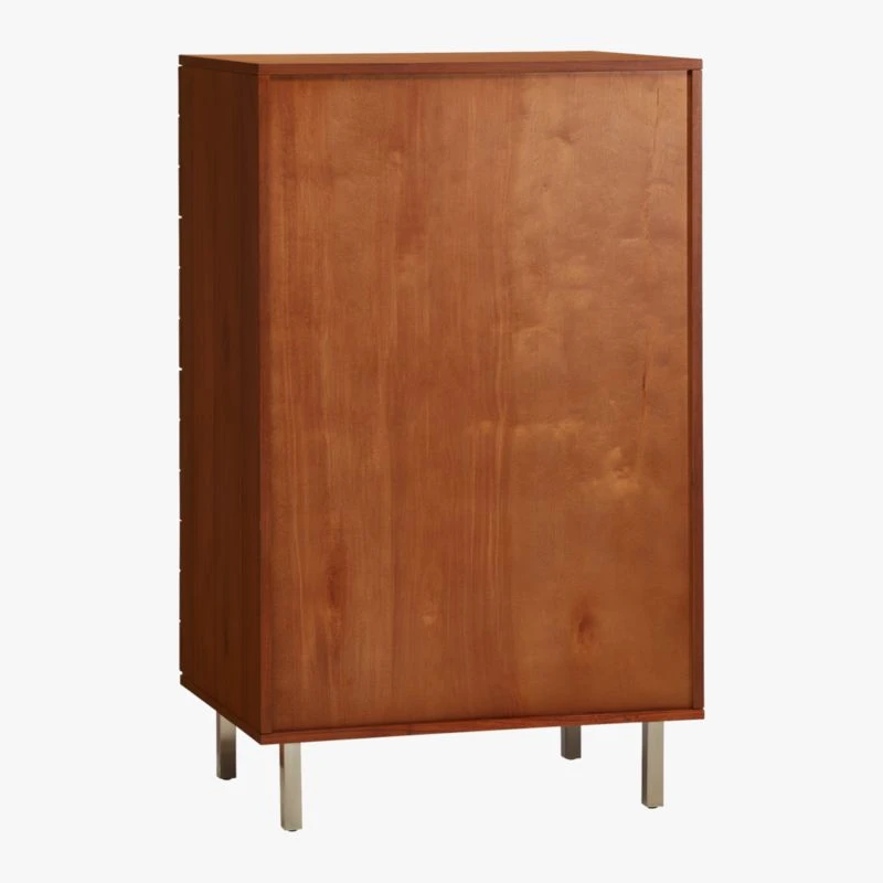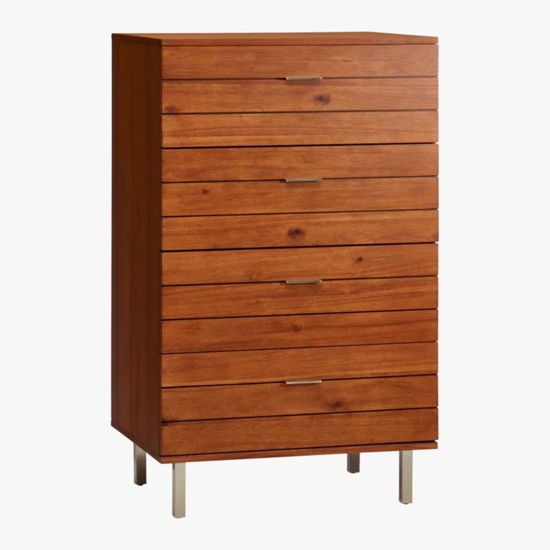 MASHstudios goes against the grain with tall storage in acacia veneer. Four deep drawers glide silently with subtle pulls. Recessed iron legs with brushed nickel finish add industrial gleam to organic form. Learn about MASHstudios on our blog. linear tall chest is a CB2 exclusive.