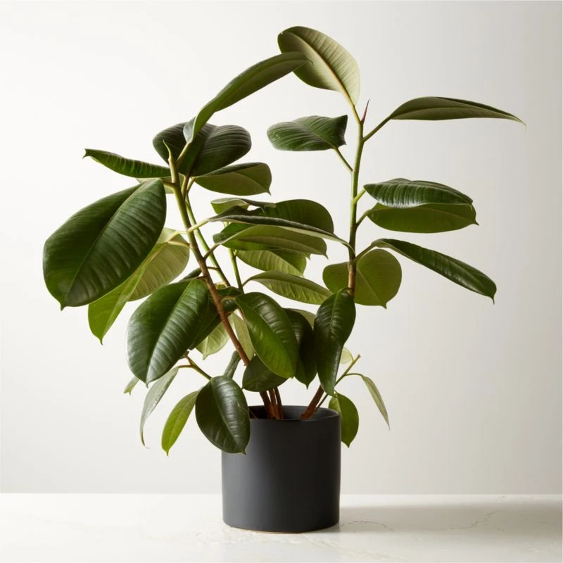 Native to the rainforests of India and South America, Ficus elastica (rubber plant) gracefully grows from its matte black ceramic pot for a modern organic aesthetic. Its thick, glossy leaves range from a rich burgundy-red to almost black. A great air purifier, ficus elastica is perfect for adding a bit of greenery to areas of the home with indirect light. It does not like change, though, so pick a spot and let it be.
