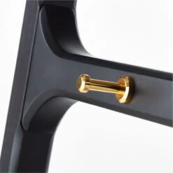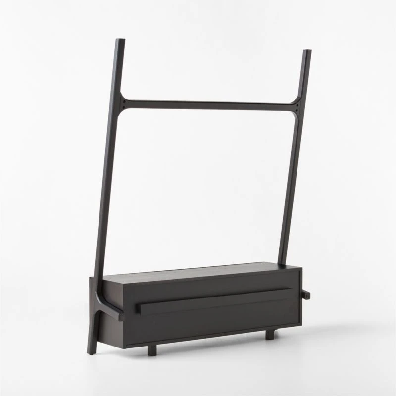 From Melbourne-based design studio VUUE, modern hall tree brings high design to entryway storage. Mahogany certified sustainable by the Forest Stewardship Council ® is finished in a dark black stain that still allows the grain to show through. Hidden drawer adds a stunning pop of natural cane that contrasts beautifully with the sleek black mahogany. Solid brass hooks hang from a bar at the top to support coats, scarves and hats. CB2 exclusive.