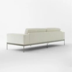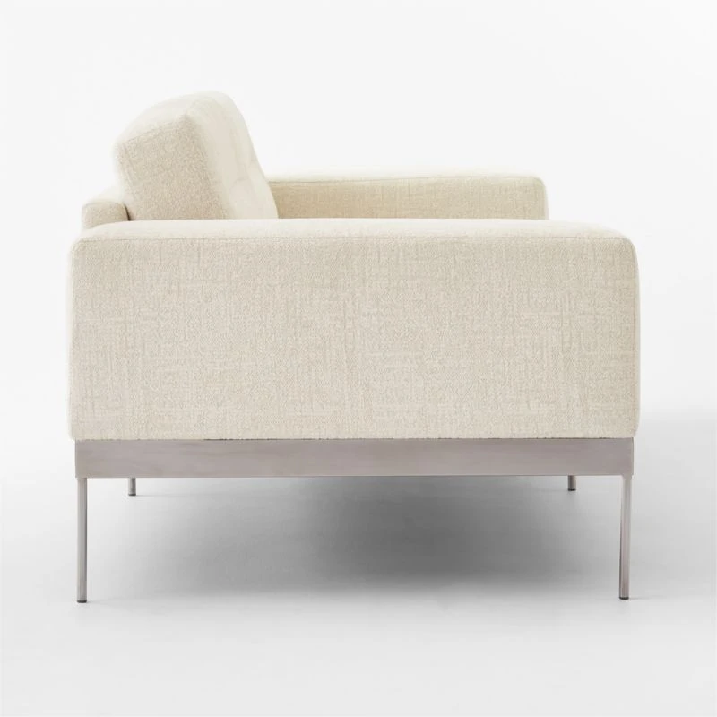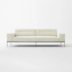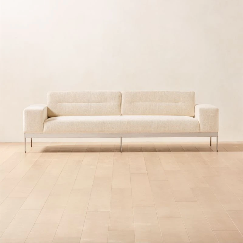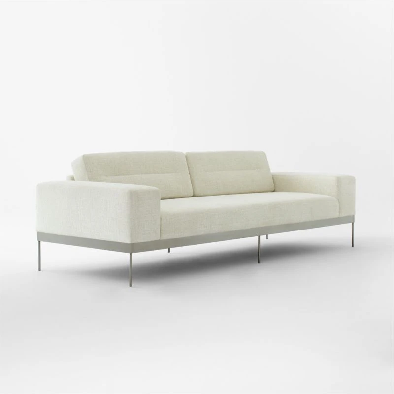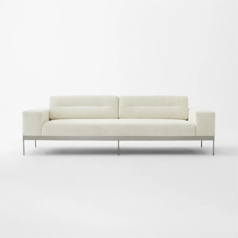 Sleek sofa by VUUE cuts a modern profile with wide arms, deep seat and slim, blackened stainless steel base. Low, loose back cushions feature a single channel tuft in the center, adding interest to this timeless silhouette. Especially inviting in an ivory textured chenille fabric that instantly updates any room. CB2 exclusive.