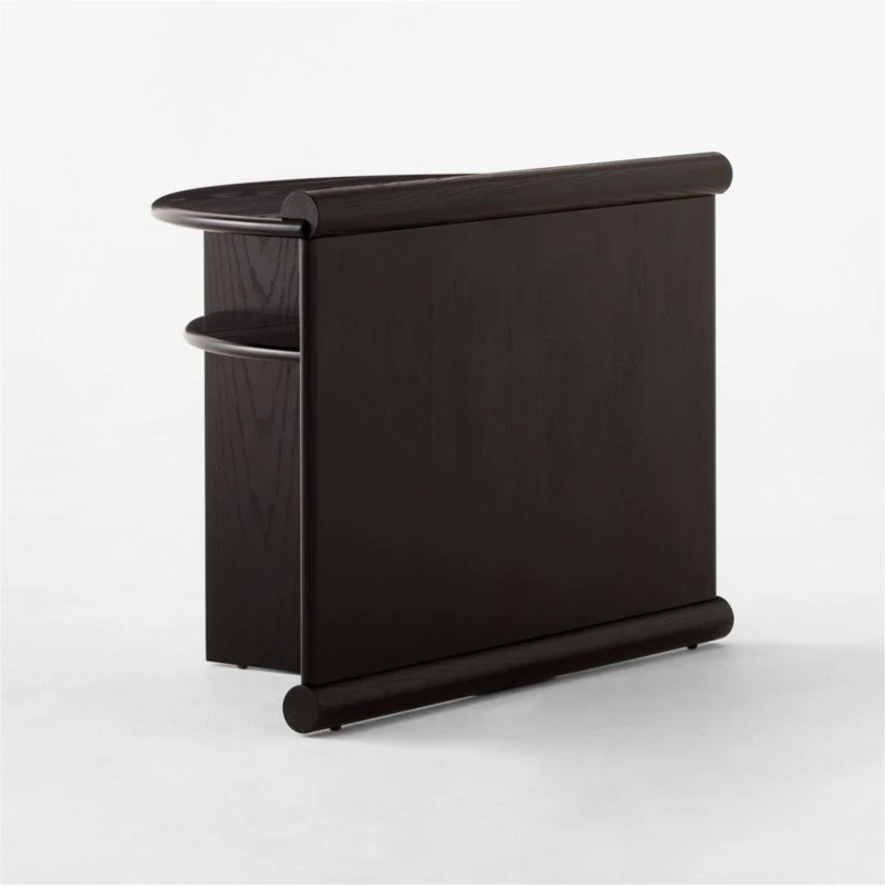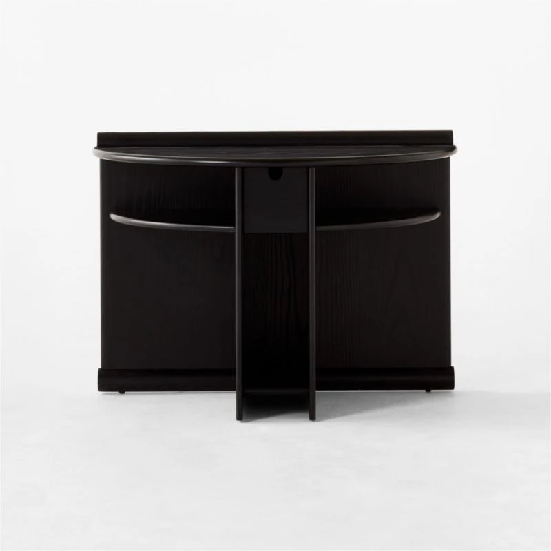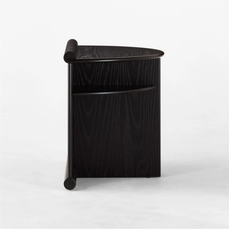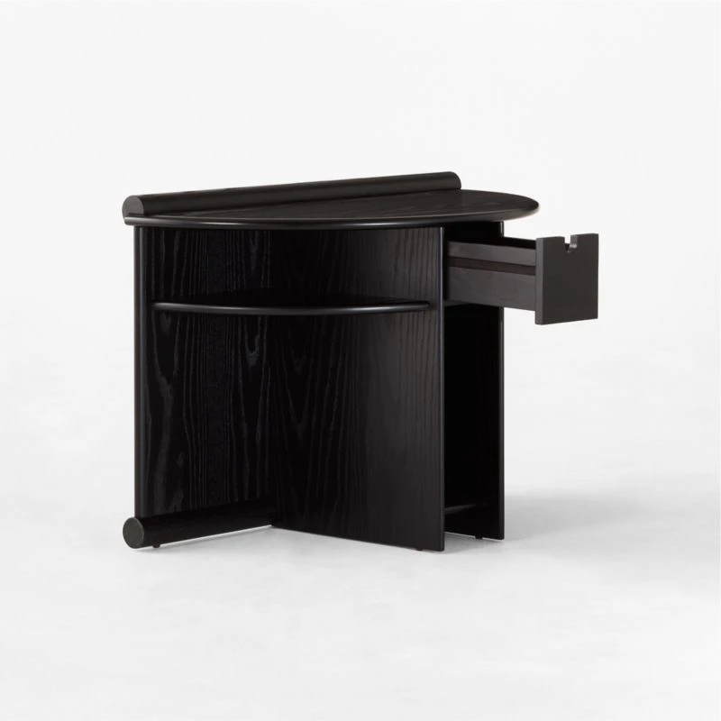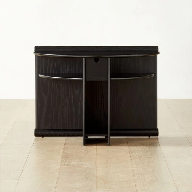 Originally designed in 1987, Gianfranco Frattini’s ebonized ash nightstand highlights his architectural precision and the era’s postmodern flair. The piece’s structural connections double as decorative accents, drawing attention to its overall elegant proportions. A pull-out drawer sits between horizontal upper shelves, while a vertical lower shelf is sized to display books and magazines. Crafted of ebonized ash veneer certified sustainable by the Forest Stewardship Council ®, the surface has subtle wire brushing that brings out the richness of the wood grain. As with the original, our reintroduction evokes appreciation for the intersection of geometry and natural materials. CB2 exclusive.
