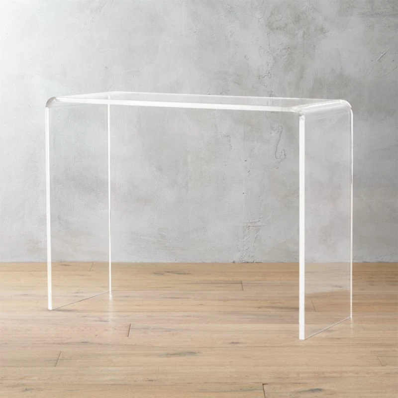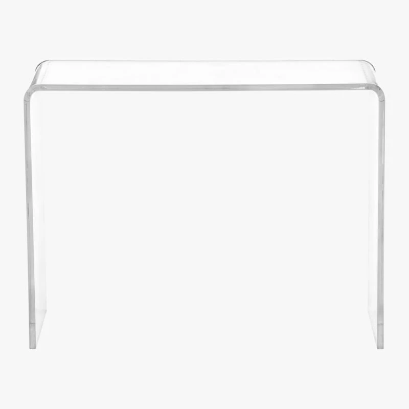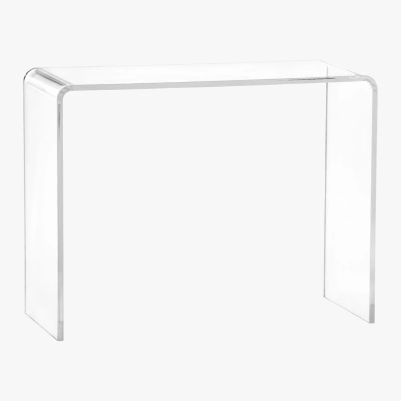 This transparent new console floats in the room without taking up permanent visual residency. Thick-cut plexi in one seamless turn adds clean mod edge to entries, hallways, and behind the sofa. Priced to disappear quickly, too.