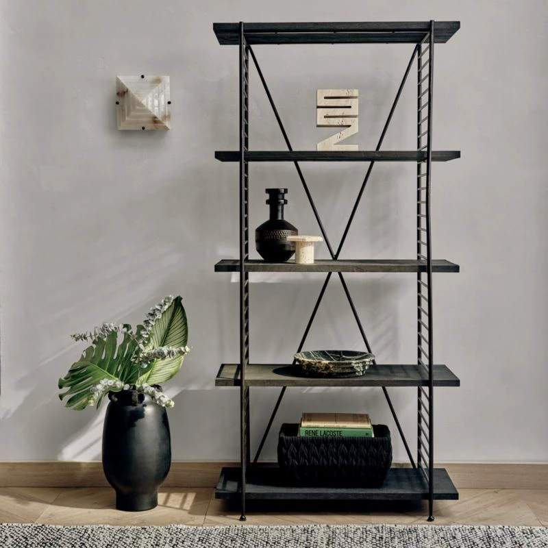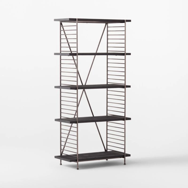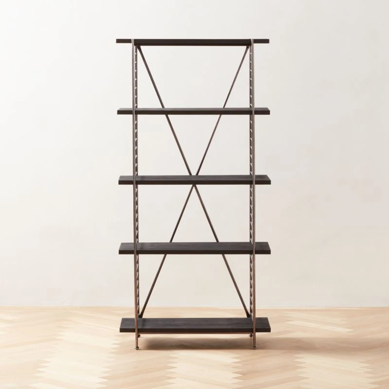 Shelves wirebrushed for texture and finished with a black stain, open bookshelf designed by VUUE suspends books, photos and artwork on a black iron tubing frame. Three adjustable shelves rest in the middle while the top and bottom stay fixed. CB2 exclusive.