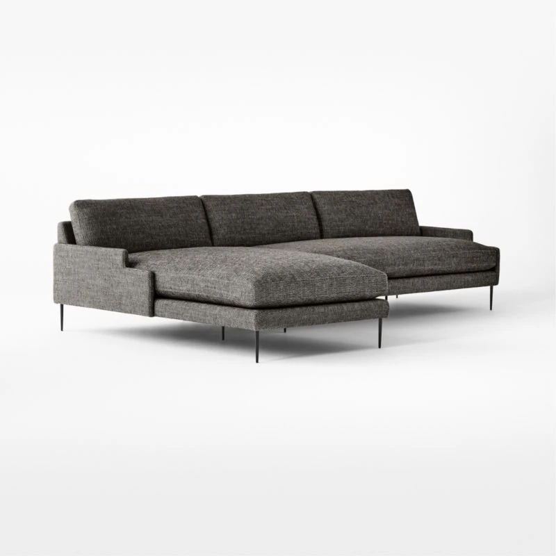 Chaise sectional sofa by Mermelada Estudio feels traditional at first, but upon closer inspection reveals modern sensibilities like thin-profile arms and a sleek silhouette. Tall, needlelike metal legs finished in a lustrous black powdercoat create graphic contrast with grey upholstery. CB2 exclusive.