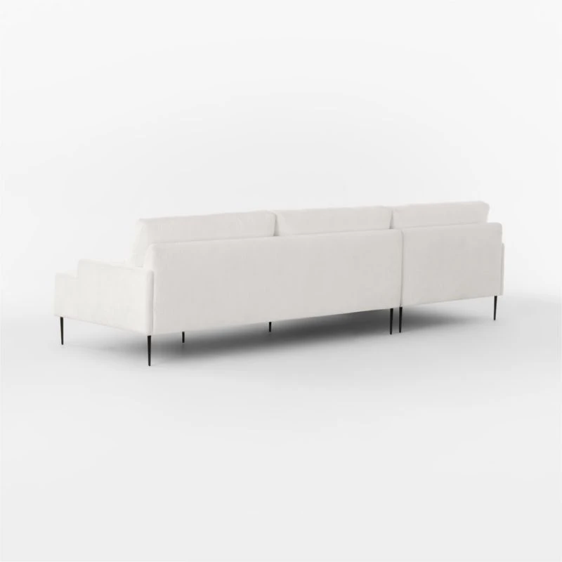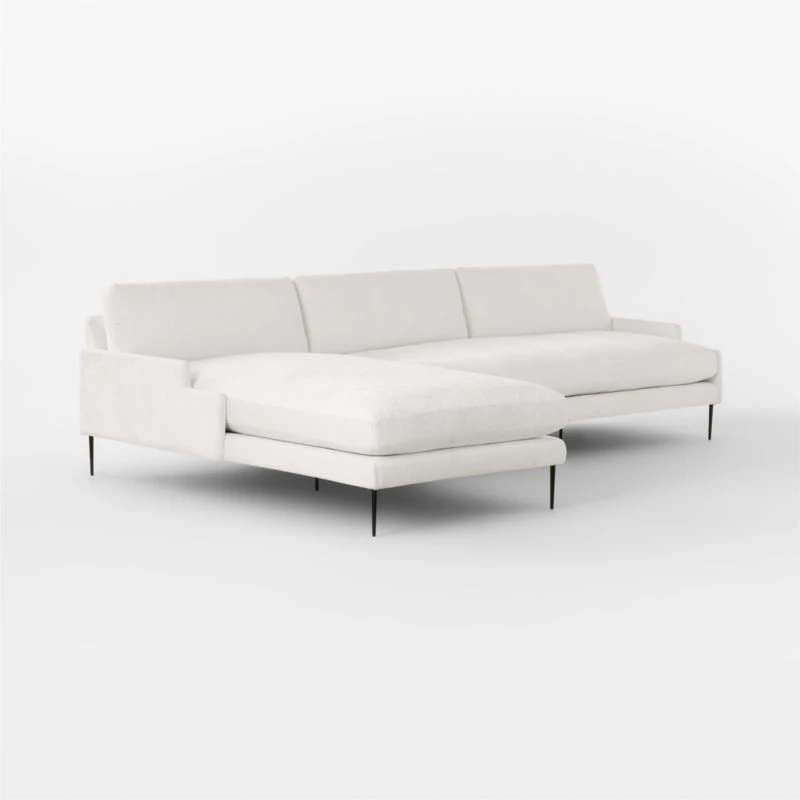 Chaise sectional sofa by Mermelada Estudio feels traditional at first, but upon closer inspection reveals modern sensibilities—like thin profile arms and a sleek silhouette. Tall, needlelike metal legs finished in a lustrous black powdercoat create graphic contrast with white upholstery. CB2 exclusive.