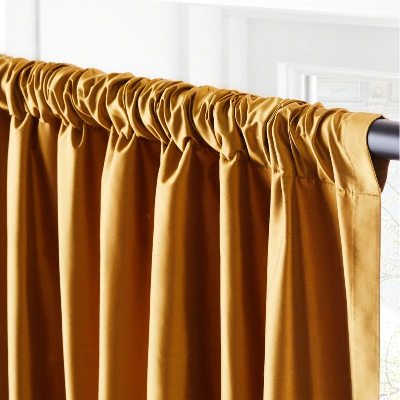 Earth-toned silk dupioni turns windows into a focal point with its luxurious sheen. Natural subtle texture adds depth and warmth to the panel so it never feels too shiny. Hangs beautifully with back tabs, rod pocket or drapery hooks. CB2 exclusive.