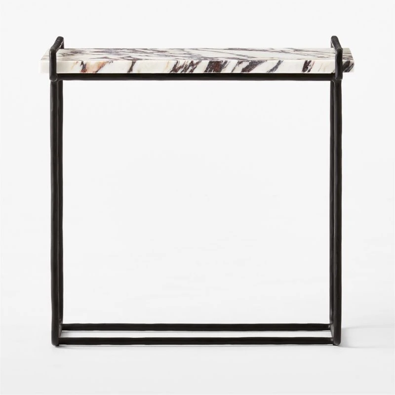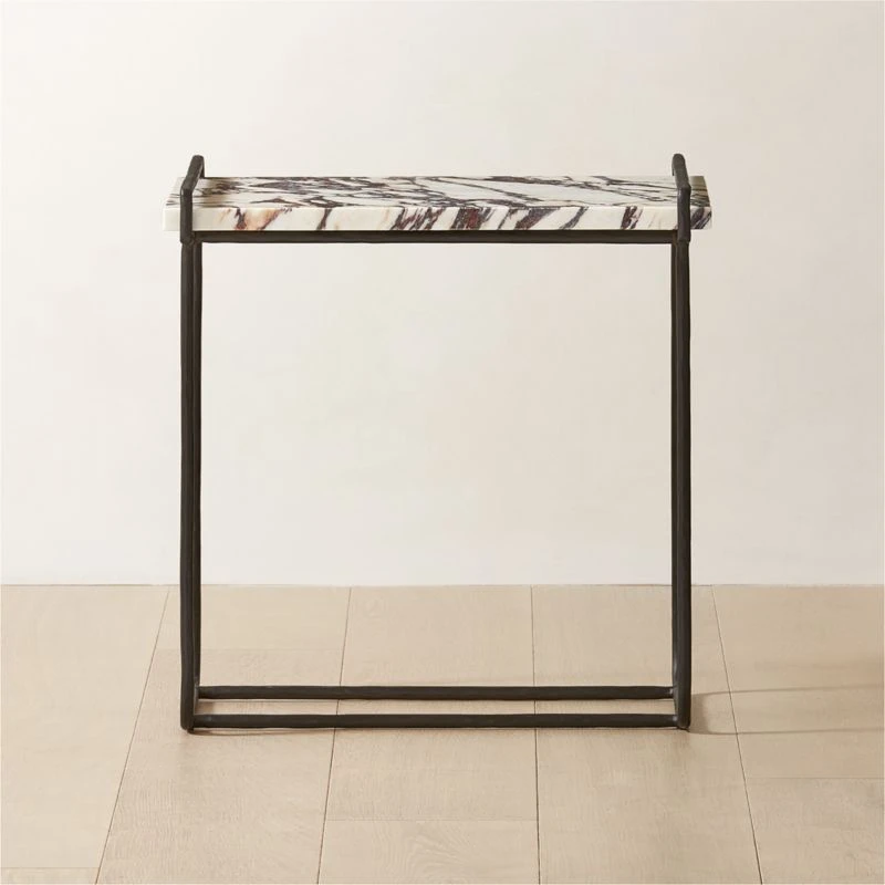 Calacatta Viola marble sourced from Italy is the lavish focal point of this sleek side table by Mermelada Estudio. The solid iron rod base has a matte finish and hand-hammered details—compliment the cream and cabernet hues of the highly active marble top. Due to the nature of marble, each tabletop will be unique. CB2 exclusive.