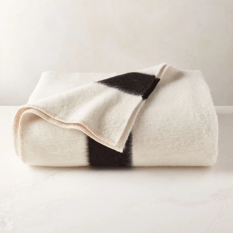 Luxurious striped blanket is woven of alpaca wool, perfect for the colder months. Geometric ivory and black stripes add texture and style to any bedding situation. CB2 exclusive.