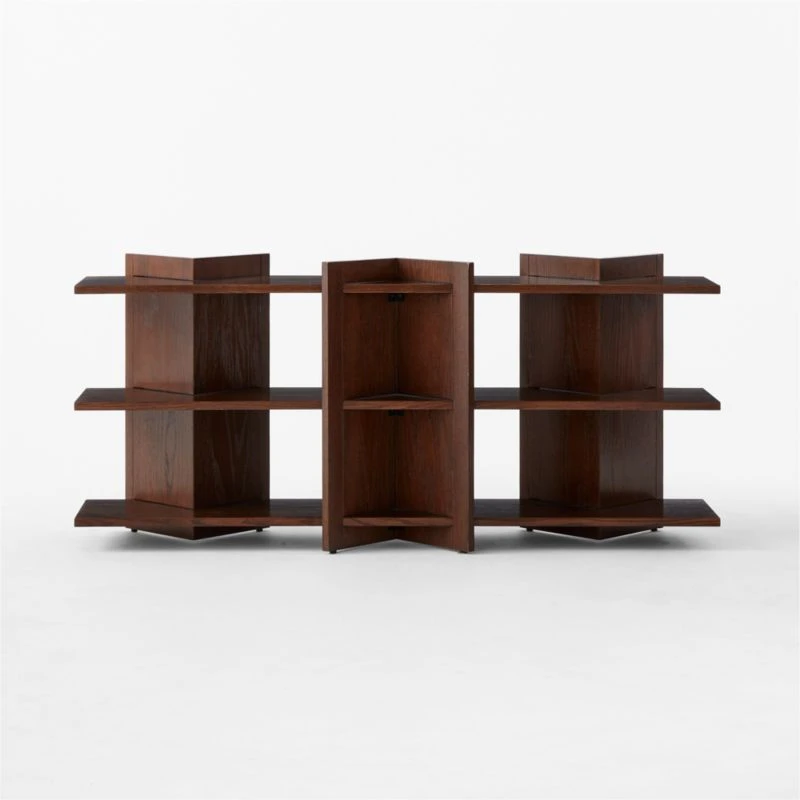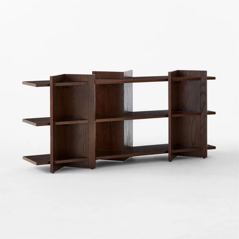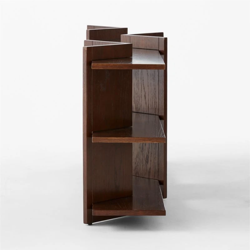 Geometric console table by VUUE works every angle. Crafted with stained oak certified sustainable by the Forest Stewardship Council ® (FSC), the rectilinear piece offers well-structured storage in its shelves and compartments. CB2 exclusive.