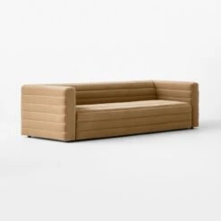 Designed by Mermelada Estudio, this extra-long vintage ’70s-inspired sofa is upholstered in rich camel velvet with plush channel tufting on all sides. “Luxe” doesn’t do it justice. CB2 exclusive.