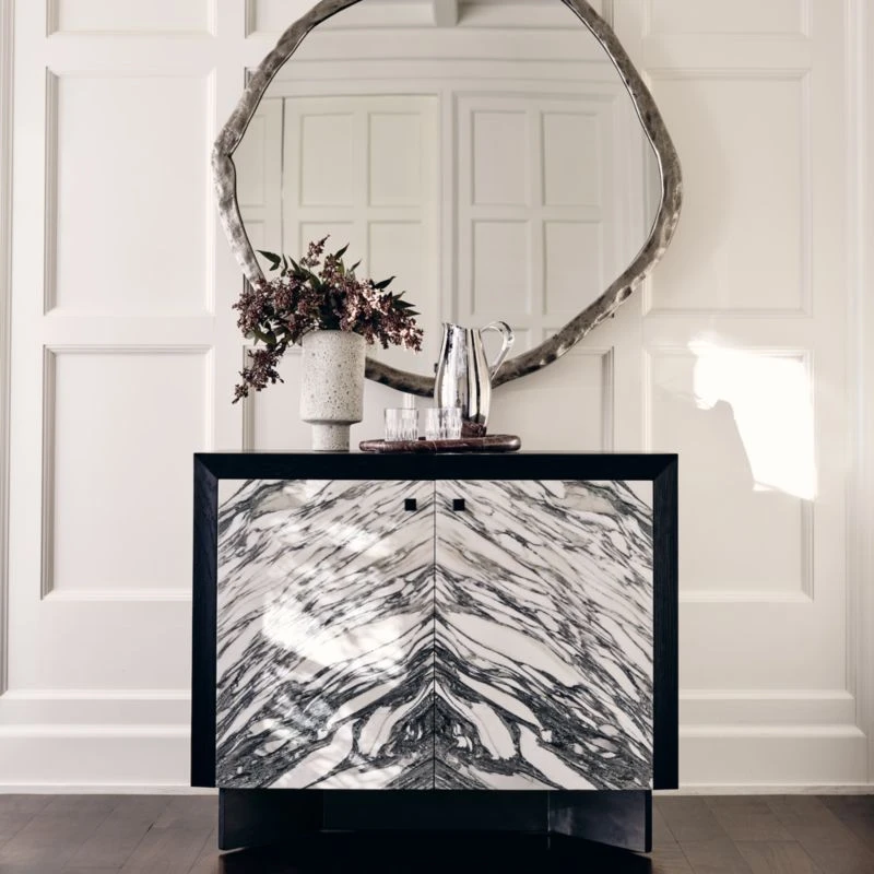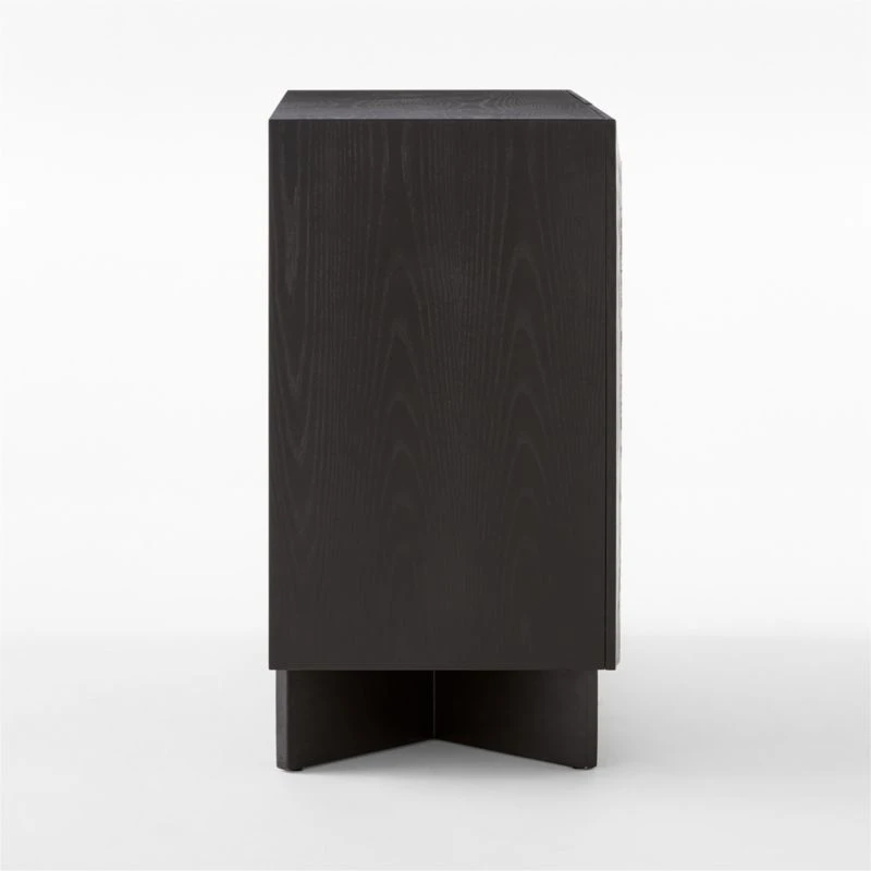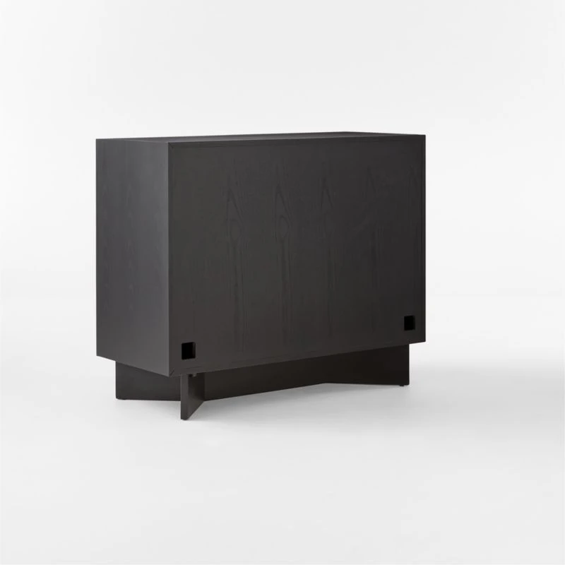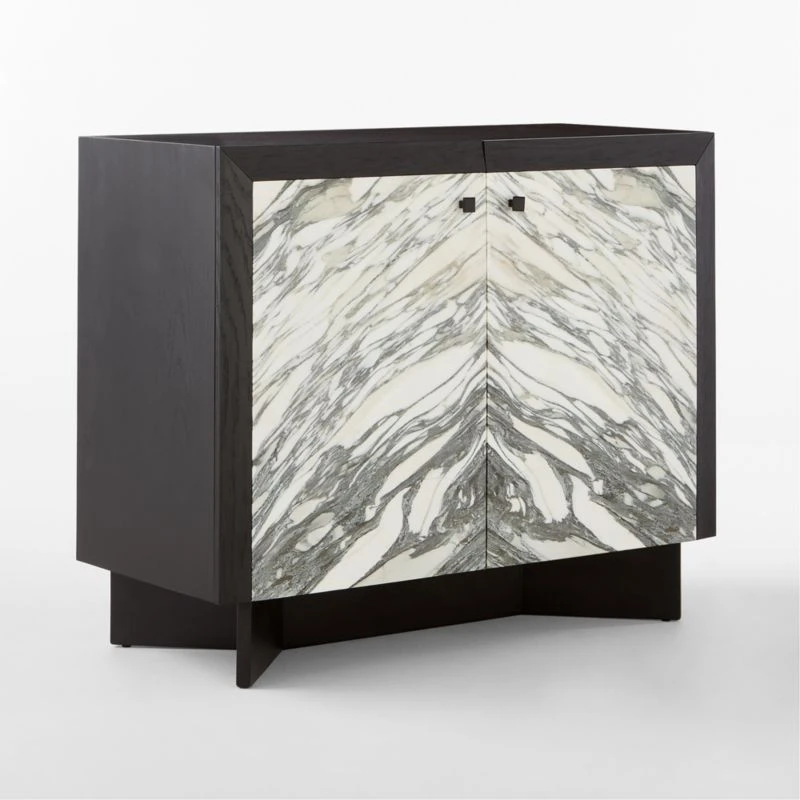Boxy bar cabinet by Jannis Ellenberger embraces contrasts of texture and tone. A frame of blackened ash wood, certified sustainable by the Forest Stewardship Council ® (FSC), has a smooth surface that showcases the wood grain’s variation. Soft-close doors are covered with Italian Arabescato marble veneer, precisely book-matched to emphasize the beauty of natural stone. Within the cabinet, two adjustable shelves provide ample storage. A dramatic addition to the dining room, the cabinet could also serve as a statement piece for the entryway. CB2 exclusive.