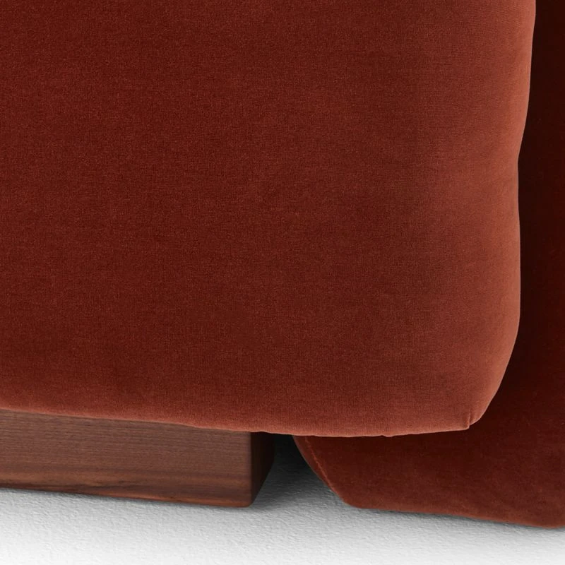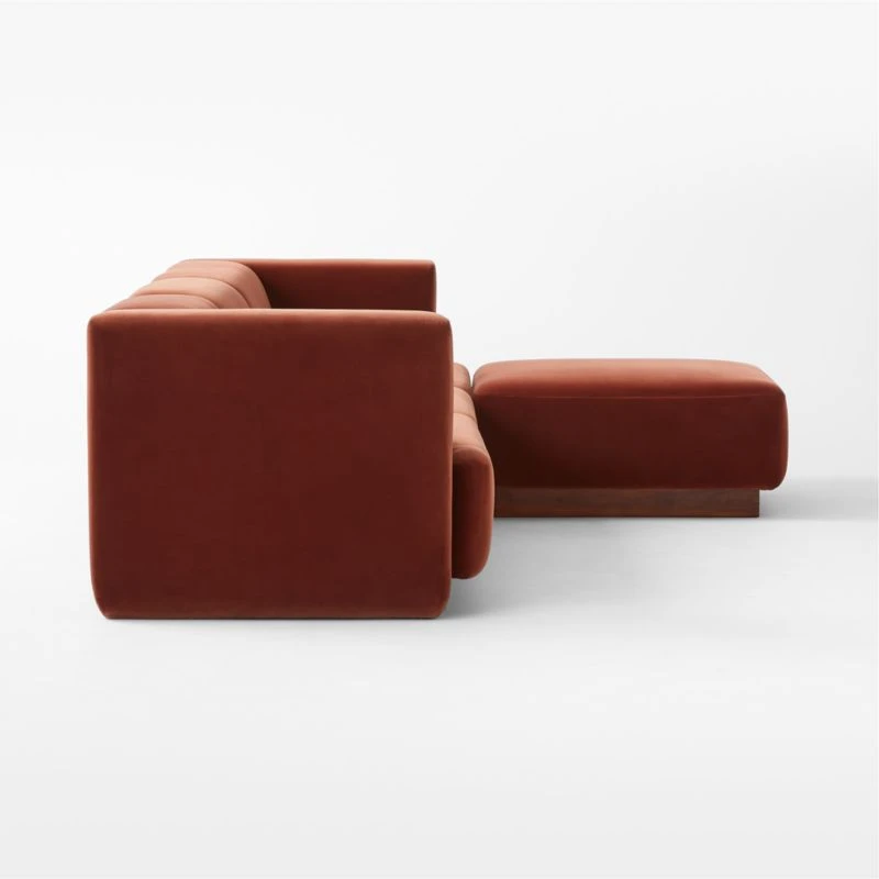 Designed by Lawson-Fenning, the Terrain furniture collection consists of modular pieces that can be arranged to create different environments. Sectional sofa features warm brown velvet upholstery. Walnut base, certified sustainable by the Forest Stewardship Council ® (FSC), reveals warm tones and striations that vary from piece to piece. Includes left-arm chair, right-arm chair, armless chair and ottoman that come together as one. CB2 exclusive.