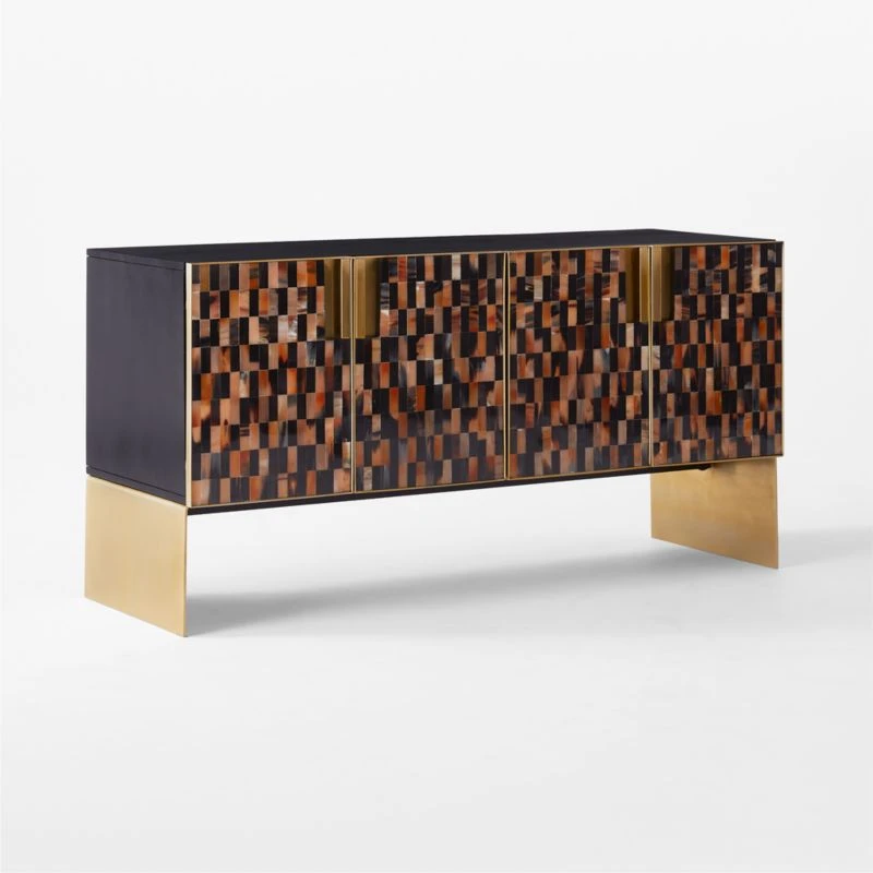 Designed by VUUE, dark acacia wood credenza makes a graphic statement in any living space. Responsibly sourced horn is hand-laid by skilled artisans in India, making each piece truly unique. Four doors open with integrated handles to reveal two shelves inside. Two thin, matte brass-finished legs elevate the piece. Learn more about VUUE on our blog. CB2 exclusive.