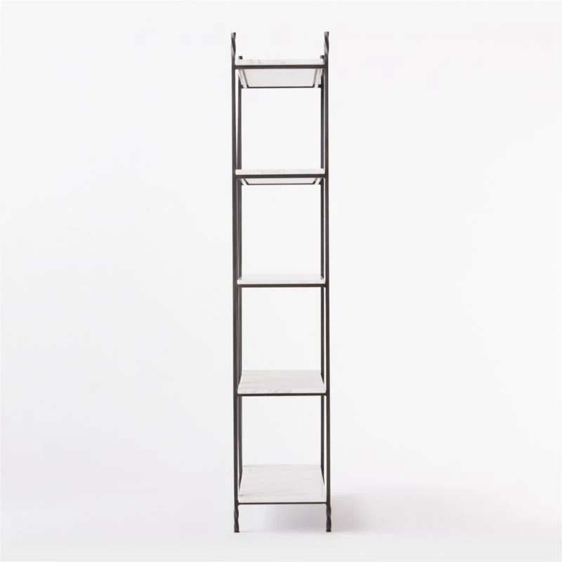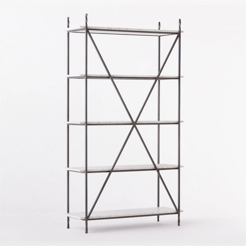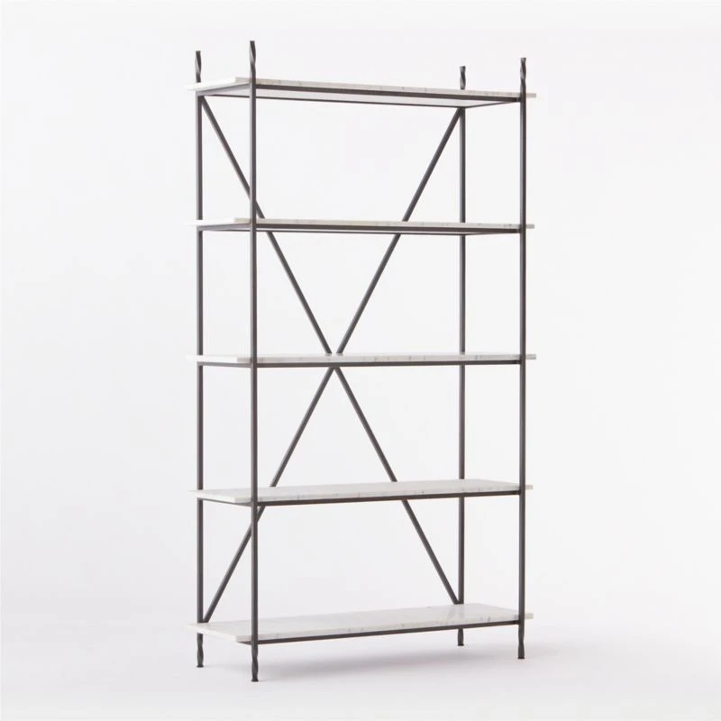 Solid iron etagere with smoked grey patina finish and modern twist detailing. Designed by Mermelada Estudio, five white marble shelves with subtle grey activity extend just beyond the frame. Works beautifully in the kitchen, dining or living room. Learn more about Mermelada Estudio on our blog. CB2 exclusive.