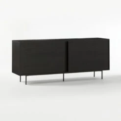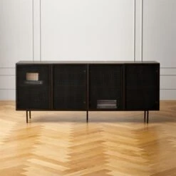 Designed by VUUE, brushed oak veneer frame gets a coating of modern matte black. Rich and textured, black mesh doors create a peek-a-boo effect, ideal for concealing media devices without losing remote functionality. Four doors open to two adjustable shelves for plenty of storage. Wire mesh cabinet credenza leaves space behind both inner corners of shelves for media cords to snake down and out the back of the piece. Learn about VUUE on our blog. CB2 exclusive.